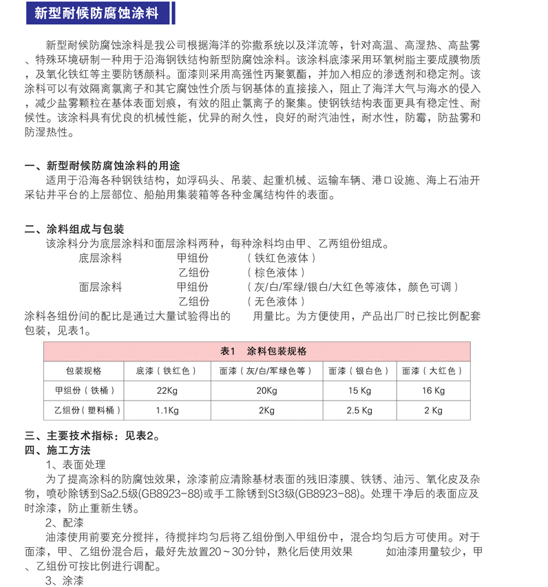 產(chǎn)品分類:各種鋼結(jié)構(gòu)用防腐蝕涂料、各種混凝土用防腐蝕涂料、沿海地區(qū)用防腐蝕涂料、高原地區(qū)用防腐蝕涂料、特種防腐蝕涂料